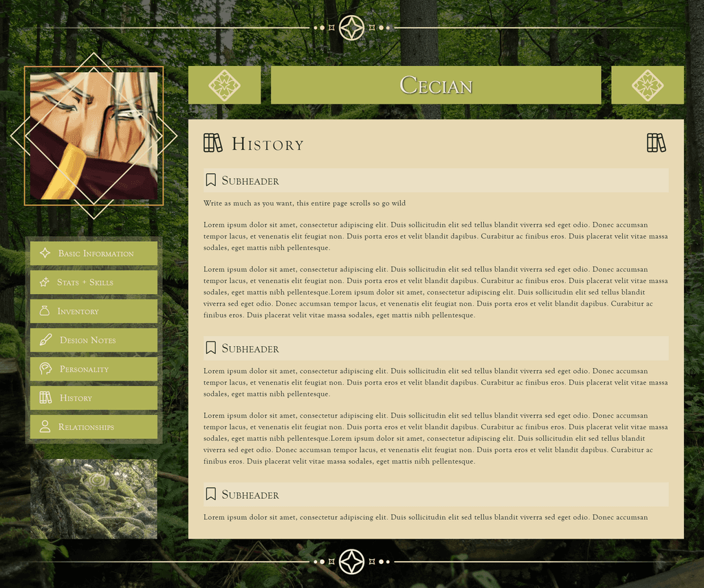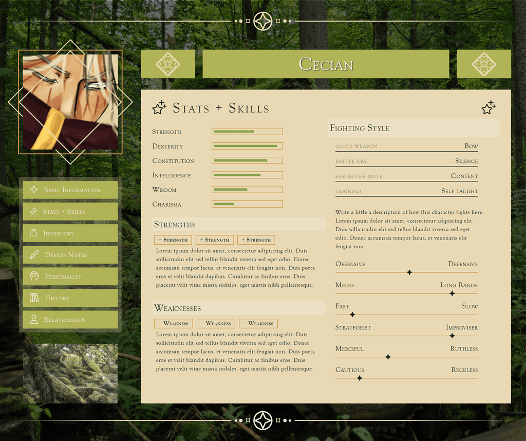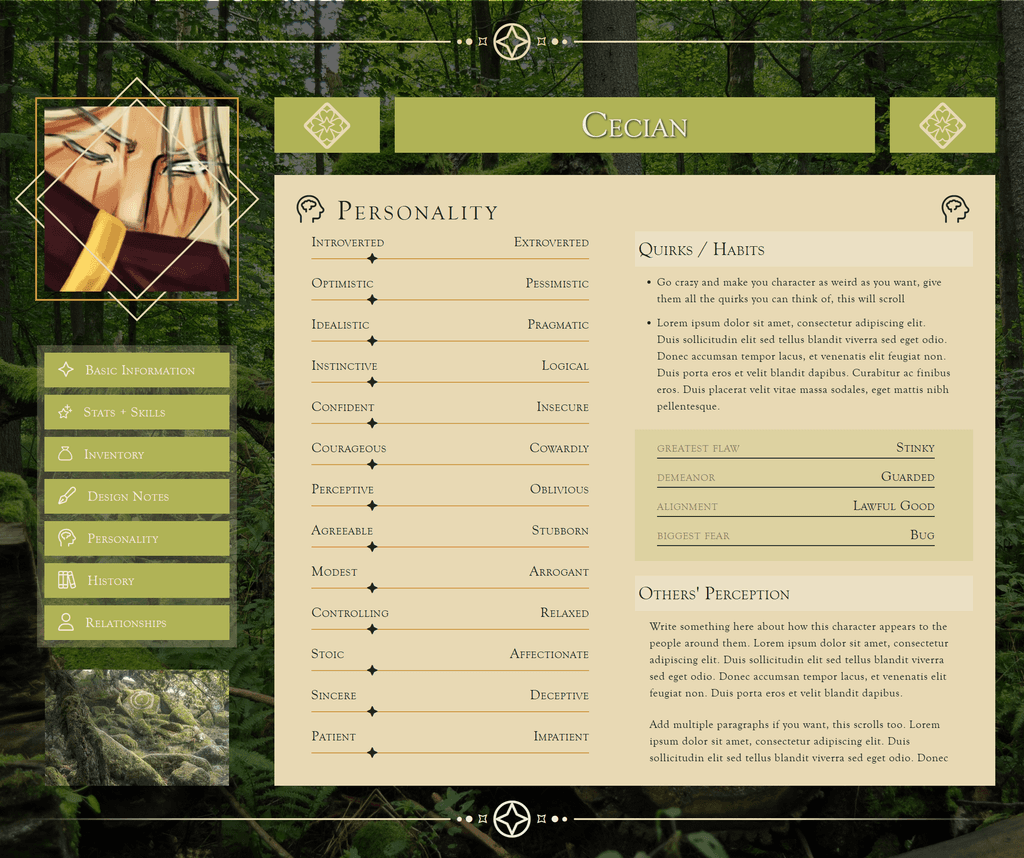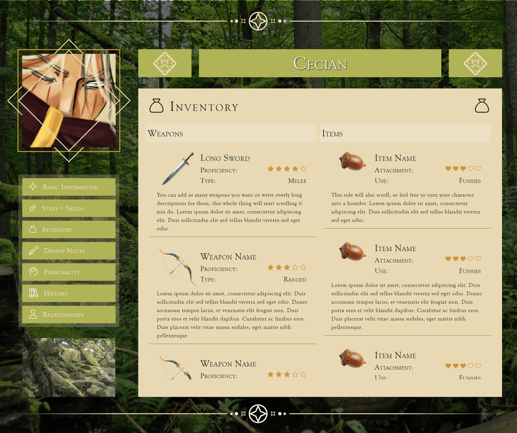 It has pages for basics, inventory, design notes, relationships, and history, so pretty much all you could need