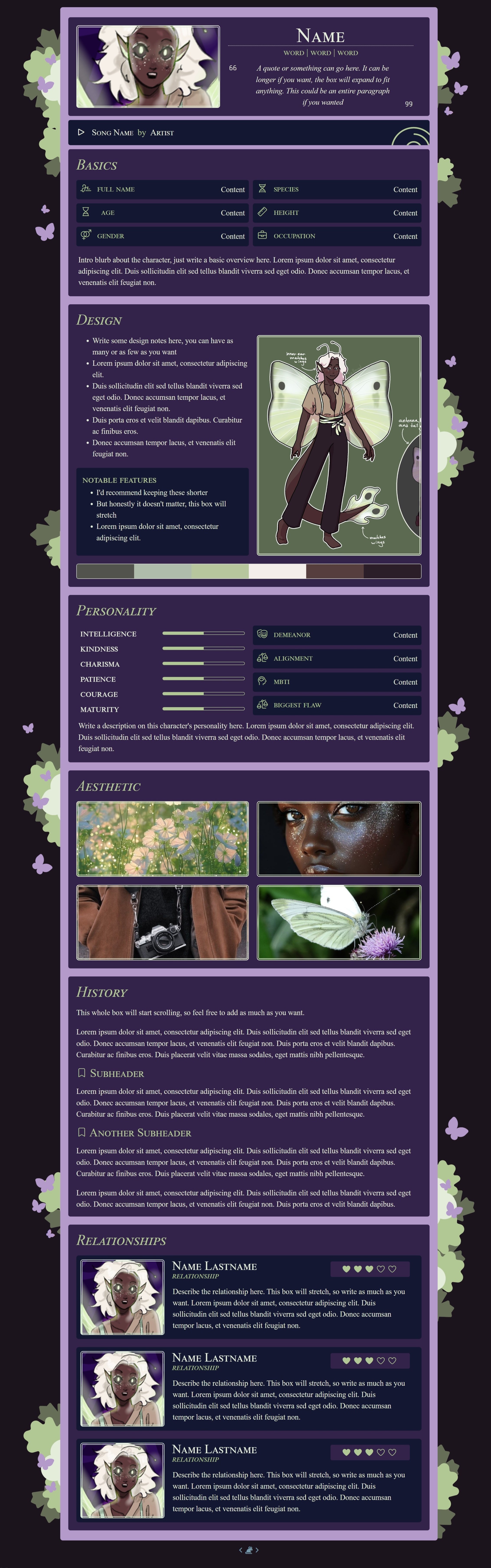 A collection of custom Toyhouse character layouts created with pure HTML and inline styling, designed to be aesthetic, readable, and responsive.