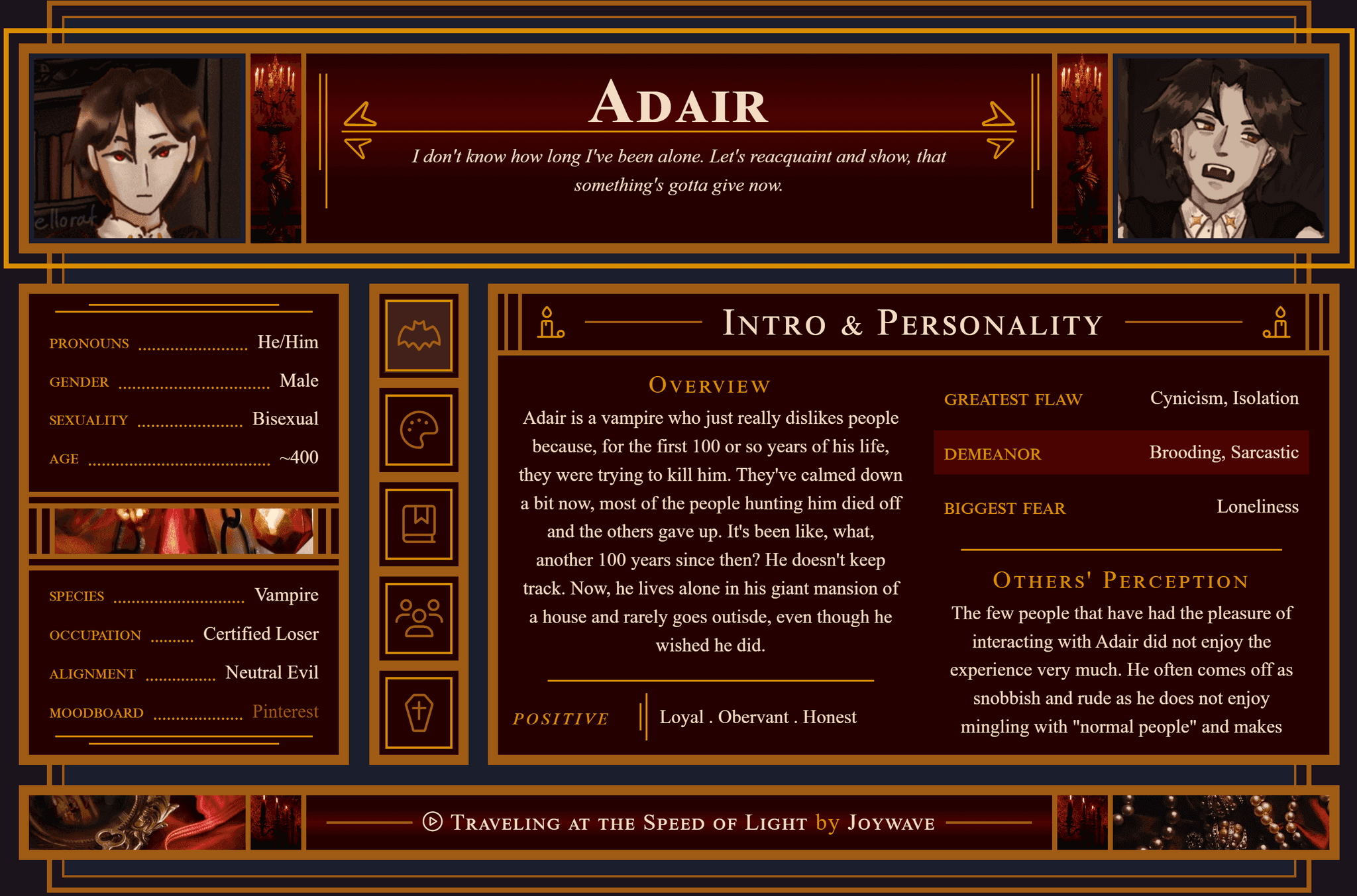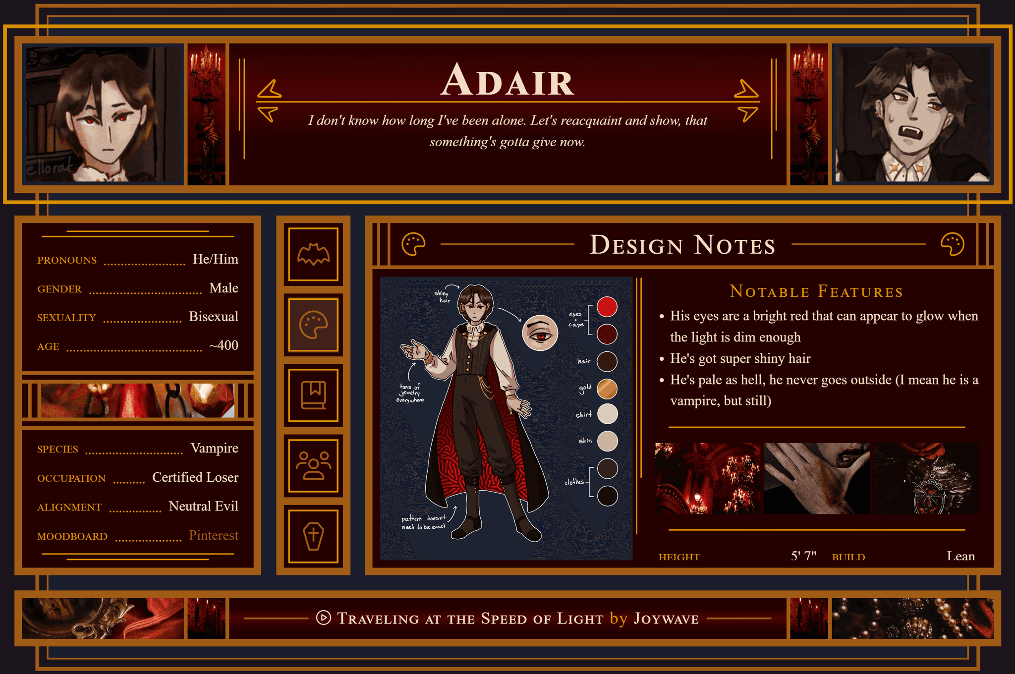 This ended up being somewhat vampire themed (hence the title), which works well since Halloween is coming up, so I'm going to pretend it was the plan all along. Adair needed an updated profile anyway, it's a win-win.