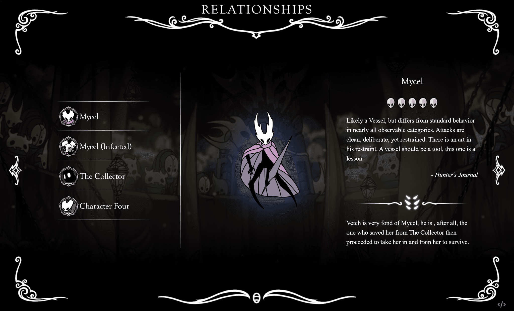 I made some Hollow Knight characters! then got bored and decided they needed themed profiles. So here's a Hollow Knight themed character profile code!