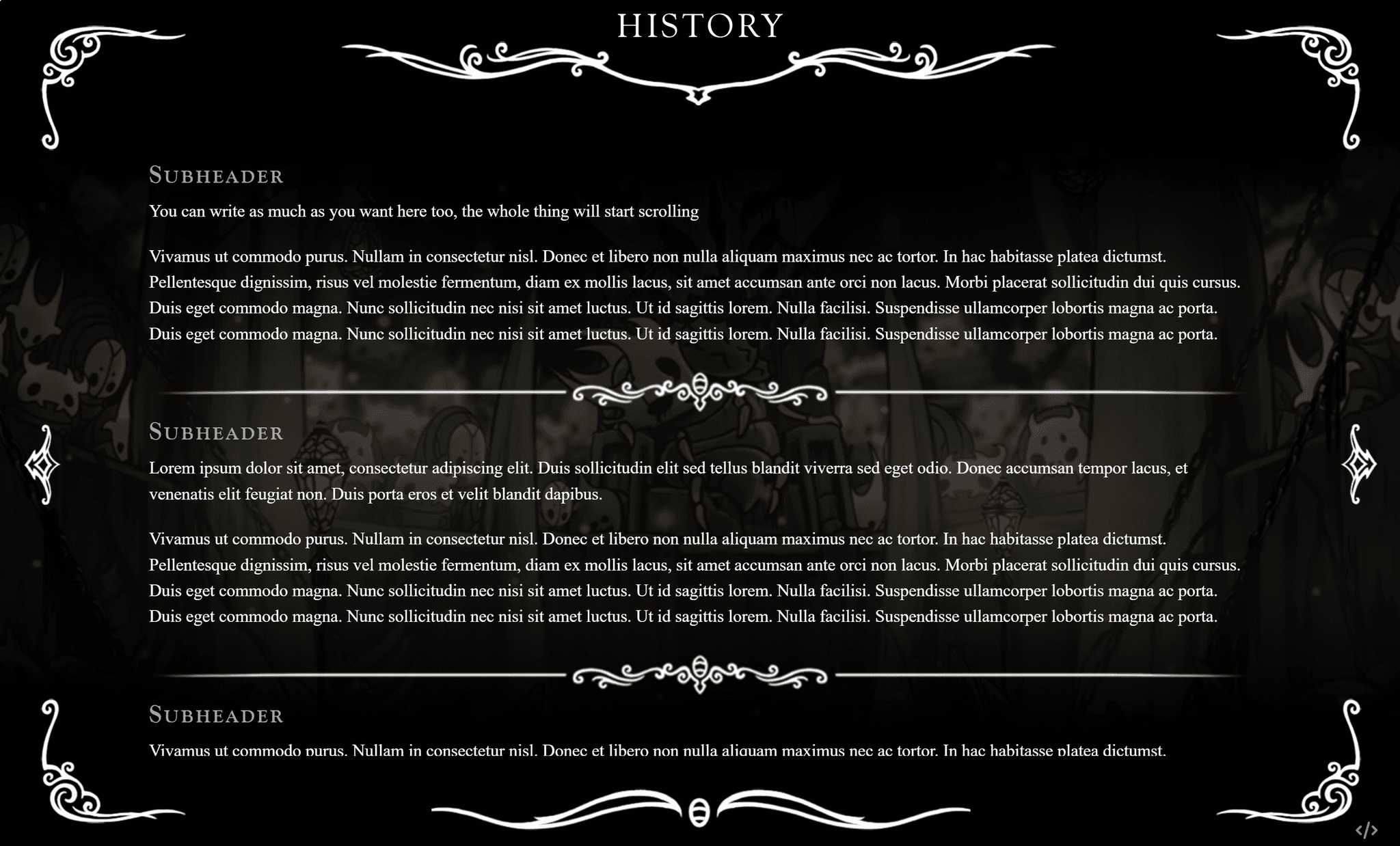 I made this because I wanted to mess around some more with overlapping elements and using lines as decoration. I think it all came out pretty well, but the design notes tab is my favorite, it just looks so nice. The overlapping-ness of this code is a bit less apparent on mobile, but it's still there a little bit.